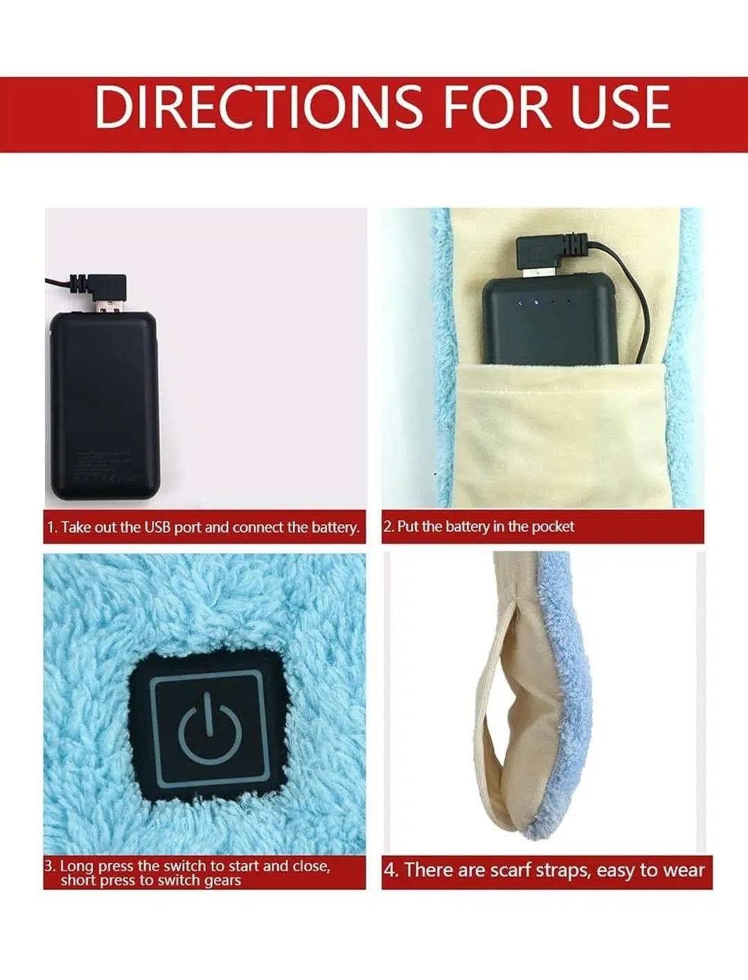 Isıtıcı eşarp hızla ısınır ve geniş bir alanda ısı üretir. Ergonomik tasarıma göre eşarp sıcak tutar. Seçilecek üç sıcaklık seviyesine sahip elektrikli ısıtmalı eşarp: alt uç 40-45C. Beyaz orta sıcaklık aralığı 45-50 'dir. Kırmızı yüksek sıcaklık aralığı 50-55 . Grafen ısıtma teknolojisi, yumuşak film ısıtma malzemesi, içten dışa hızlı ısıtma sayesinde, USB şarj kafası 5V pile bağlanır, ısıtmak için mobil güç kaynağını bağlamanız gerekir, pil çantasını gizlemek kullanımı kolaydır, pil pil çantasına konabilir (bu ürüne güç kaynağı dahil değildir).Tekrar tekrar yıkanabilir, sızıntı önleyici. Yüzeyi pelüş pamuklu yumuşak kumaştan üretilmiştir.